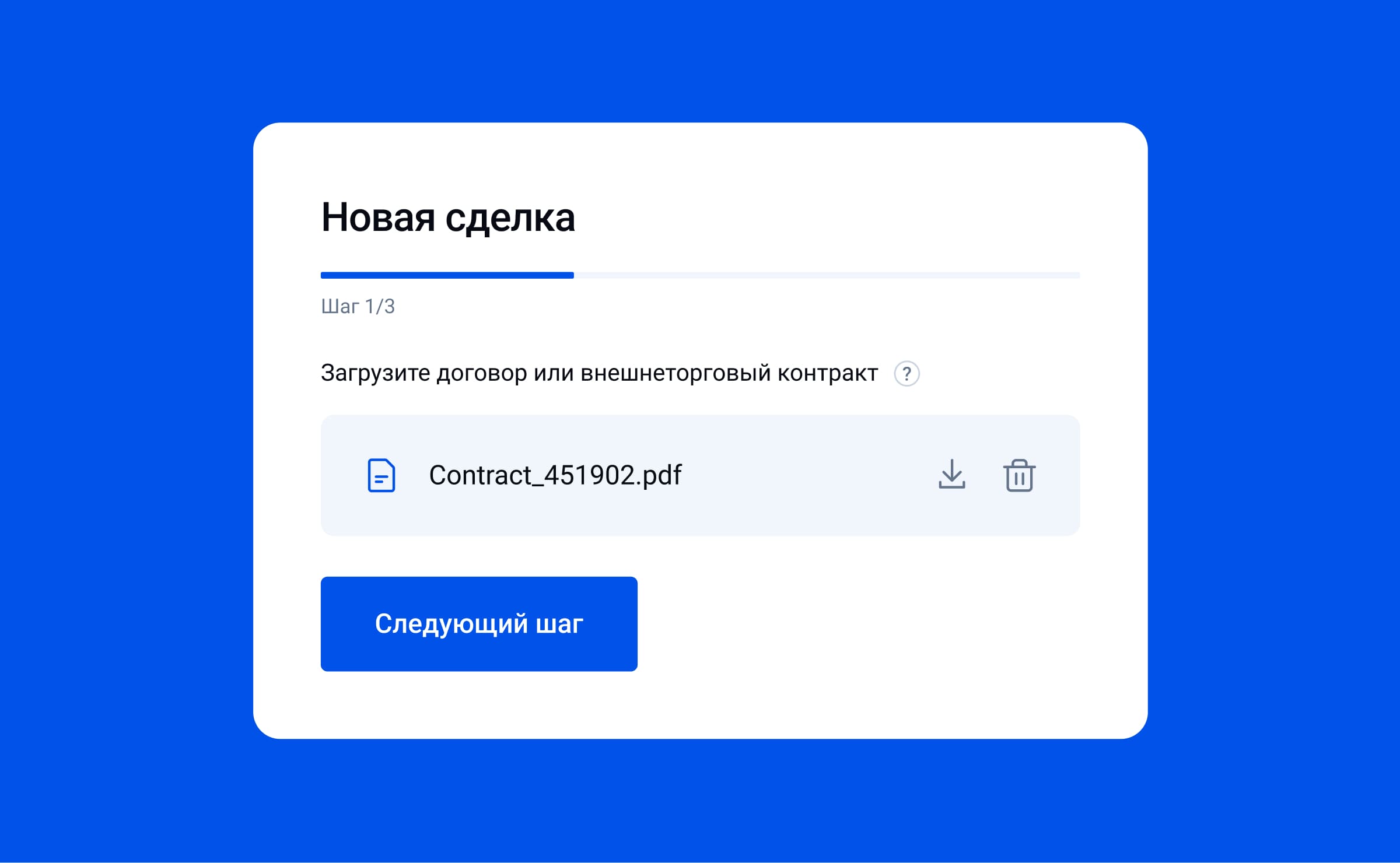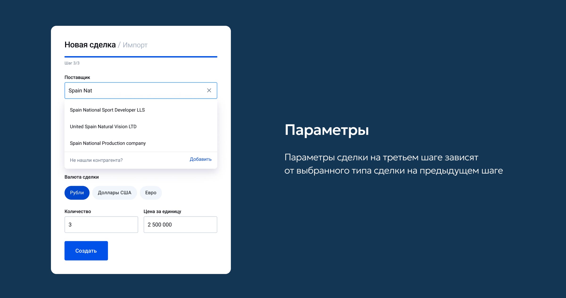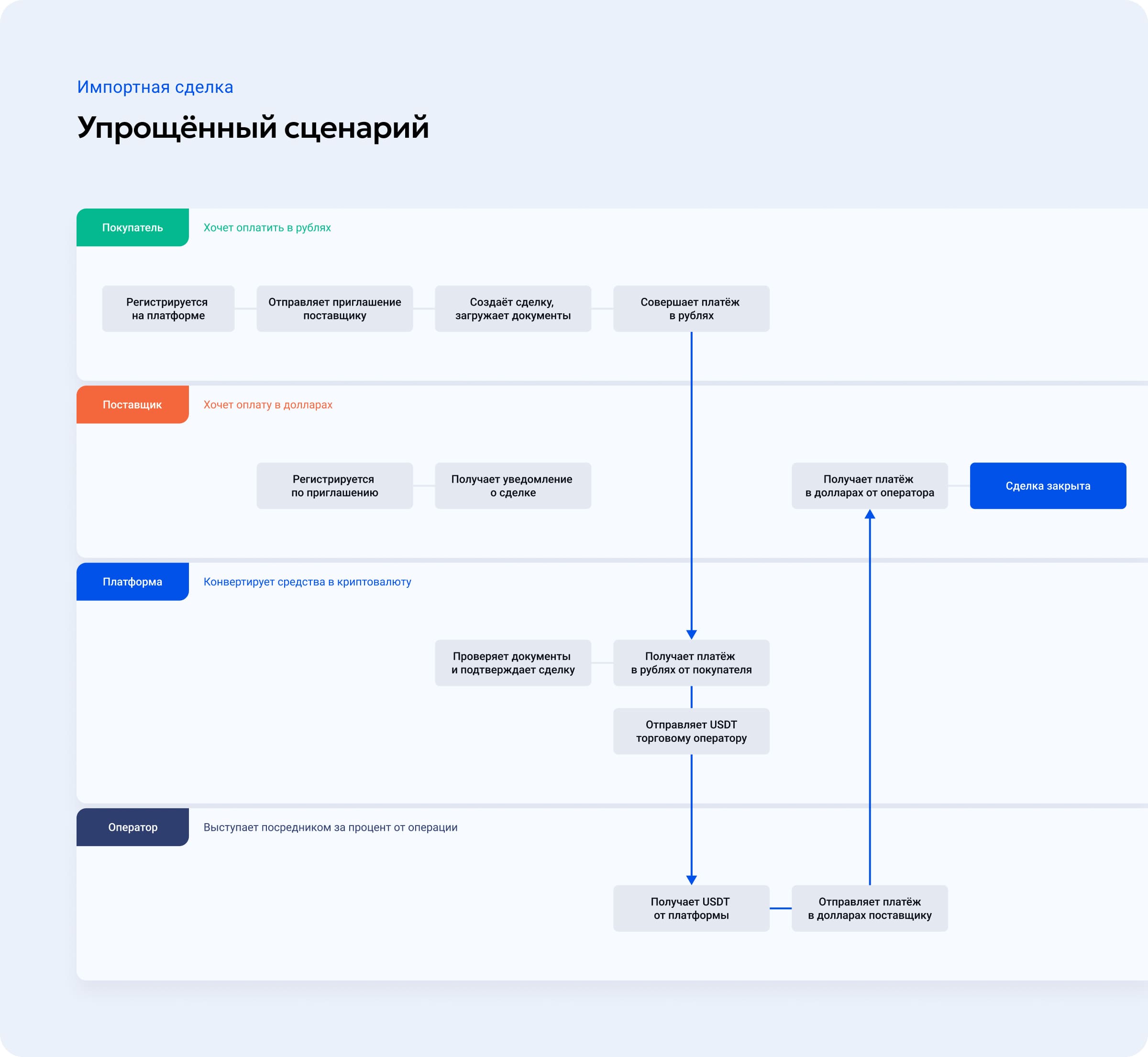 В MVP предполагается два типа сделок: импорт и экспорт. Платежная схема практически одинаковая, только работает в разные стороны в зависимости от типа.